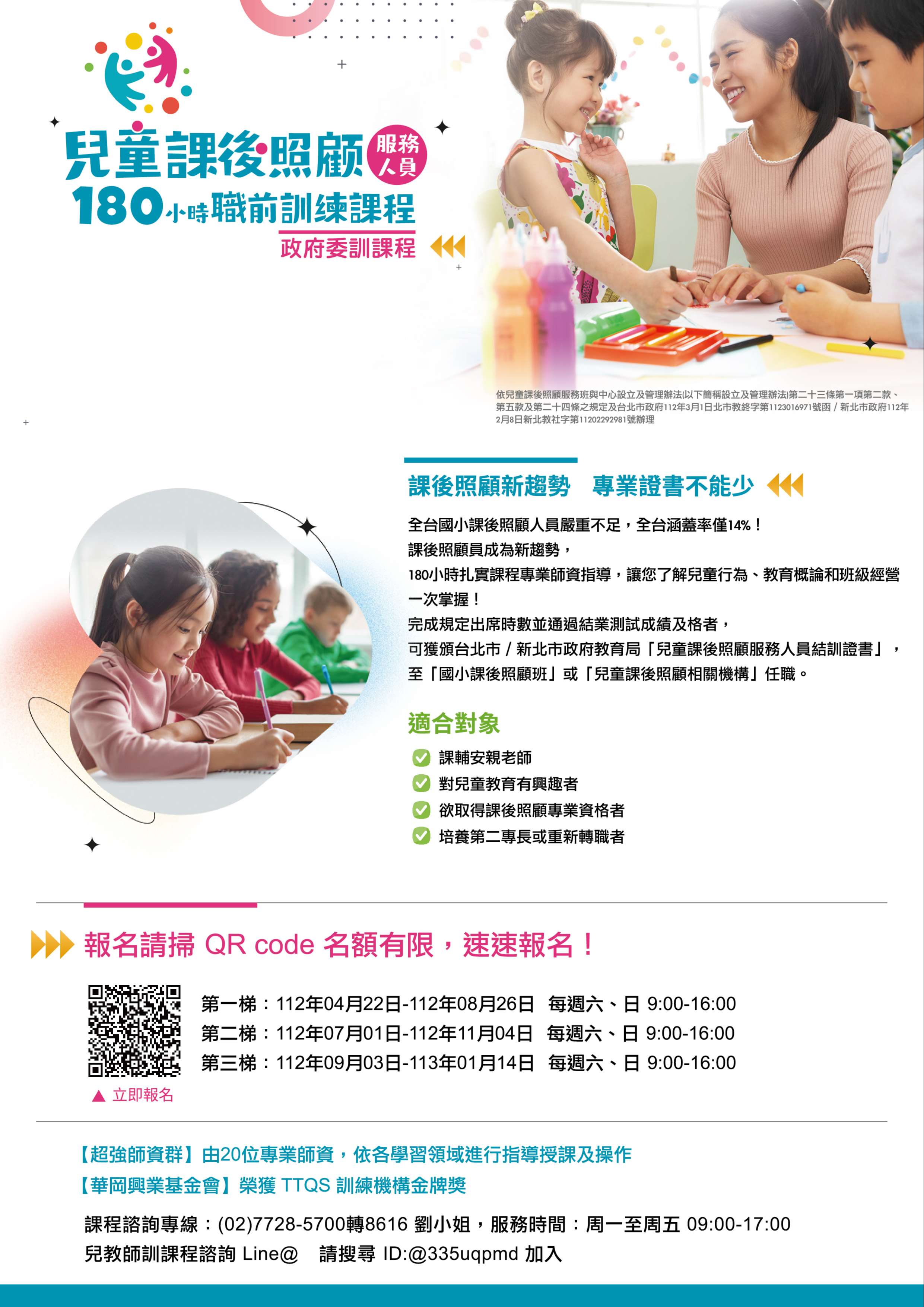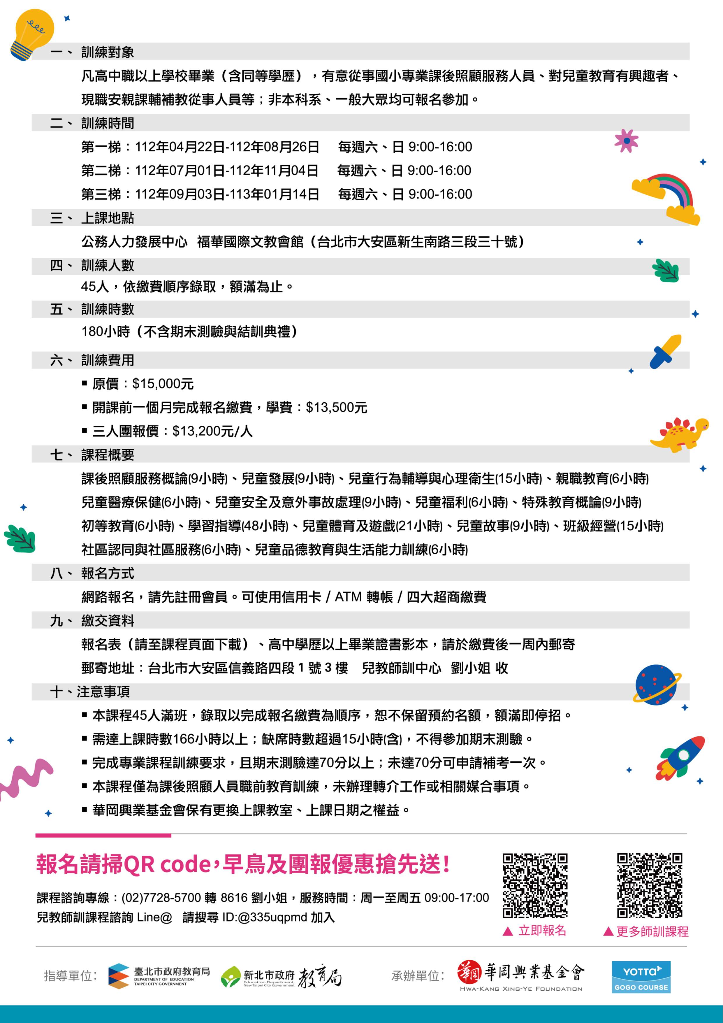 (一)招生對象:凡高中職(含)以上學校畢業,有意從事國 小專 業課後照顧服務人員並對兒童教育有興趣者或現職安親課輔補 教從業人員均可報名參加,依報名繳費順序錄取,額滿為止。 凡符合「兒童課後照顧服務班與中心設立及管理辦法」第23條 任一資格者,毋須報名此課程。 上課地點:【公務人力發展中心福華國際文教會 館】台北市大安區新生南路三段30號