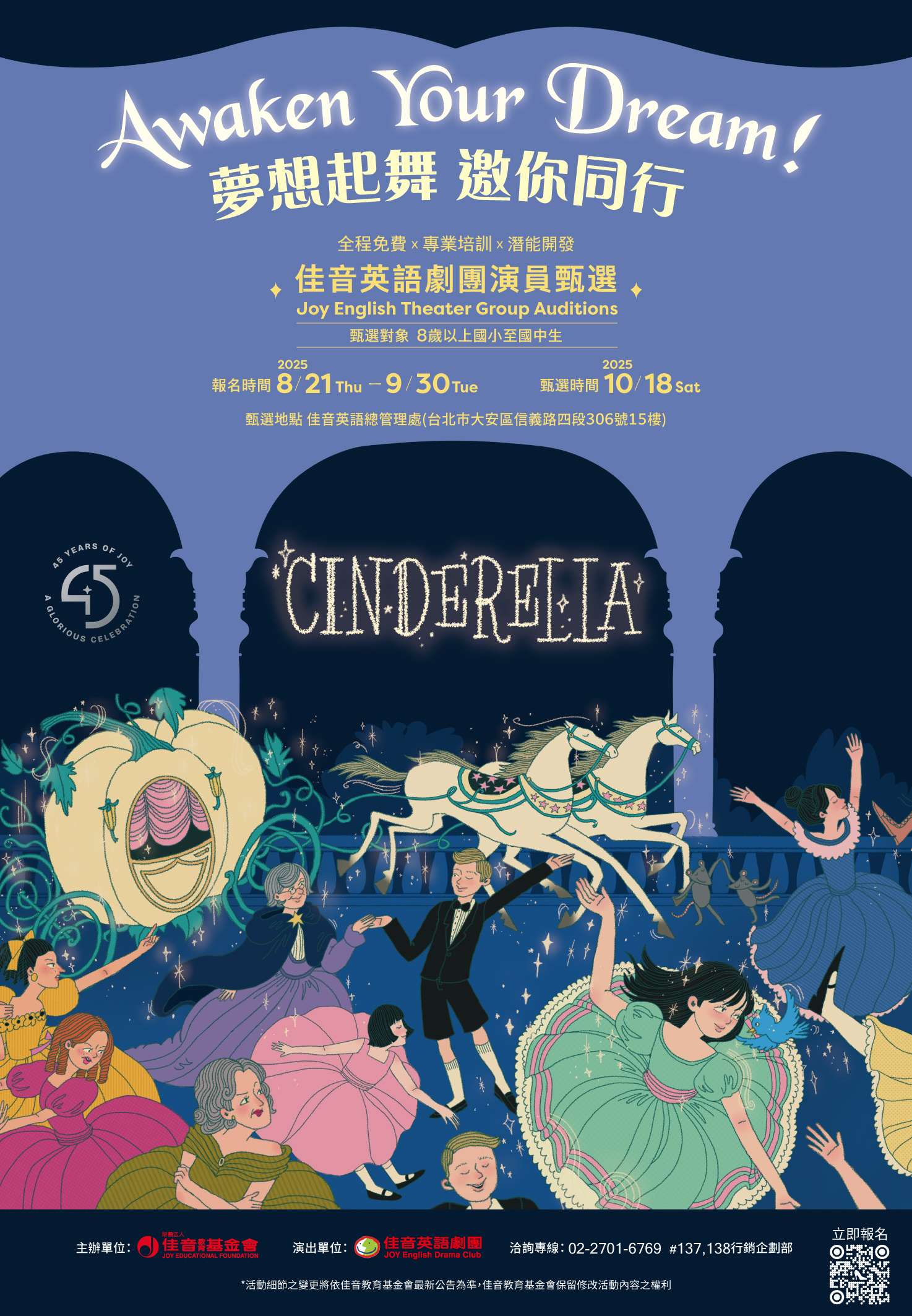 二、英語劇團招募團員甄選資訊簡述如下: (一)報名時間:自114年8月21日(星期四)至114年9月30日(星期 二)止。 (二)報名方式:採網路報名,逕至「佳音英語劇團甄選網站」 網址:https://drama.joy.com.tw/drama/home (三)甄選對象:具2年以上英語學齡,對表演藝術有興趣之國小、國中生。 (四)年齡限制:8歲以上國小、國中生。 (五)甄選時間:114年10月18日(星期六)(六)甄選地點:佳音英語總管理處(台北市大安區信義路四段306 號15樓)
