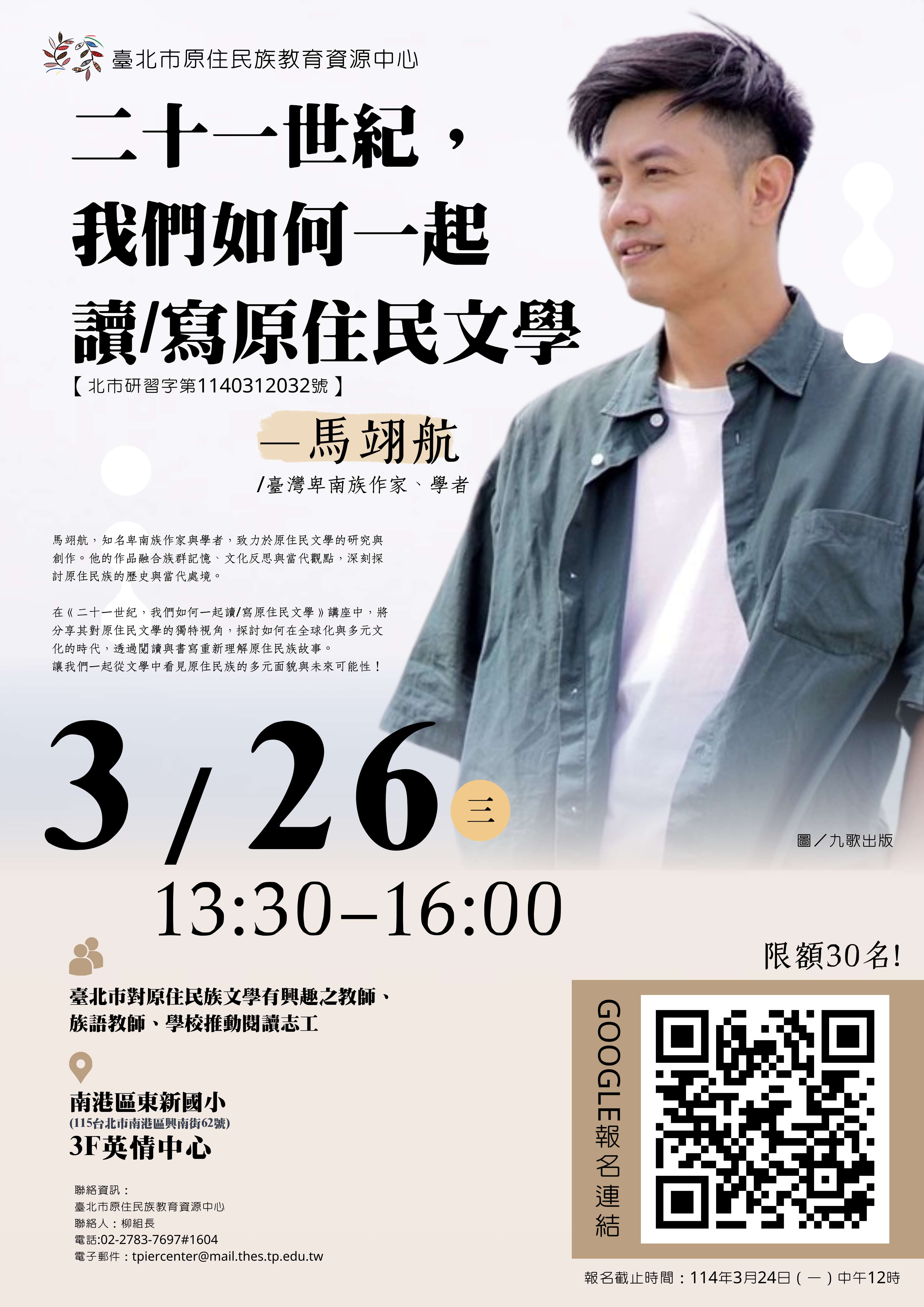 二、旨案工作坊研習資訊如下: (一)講座主題:二十一世紀,我們如何一起讀寫原住民文學 (二)講師:馬翊航/臺灣知名卑南族作家、學者 (三)北市研習字第1140312032號 (四)研習時間:114年3月26日(星期三) 13:30-16:00 (五)研習地點:東新國小 3F 英情中心(台北市南港區興南 街62號) (六)研習對象:臺北市公私立國高中、小學教職員、對原住民族文學有興趣之人員、族語教師、學校推動閱讀志工。