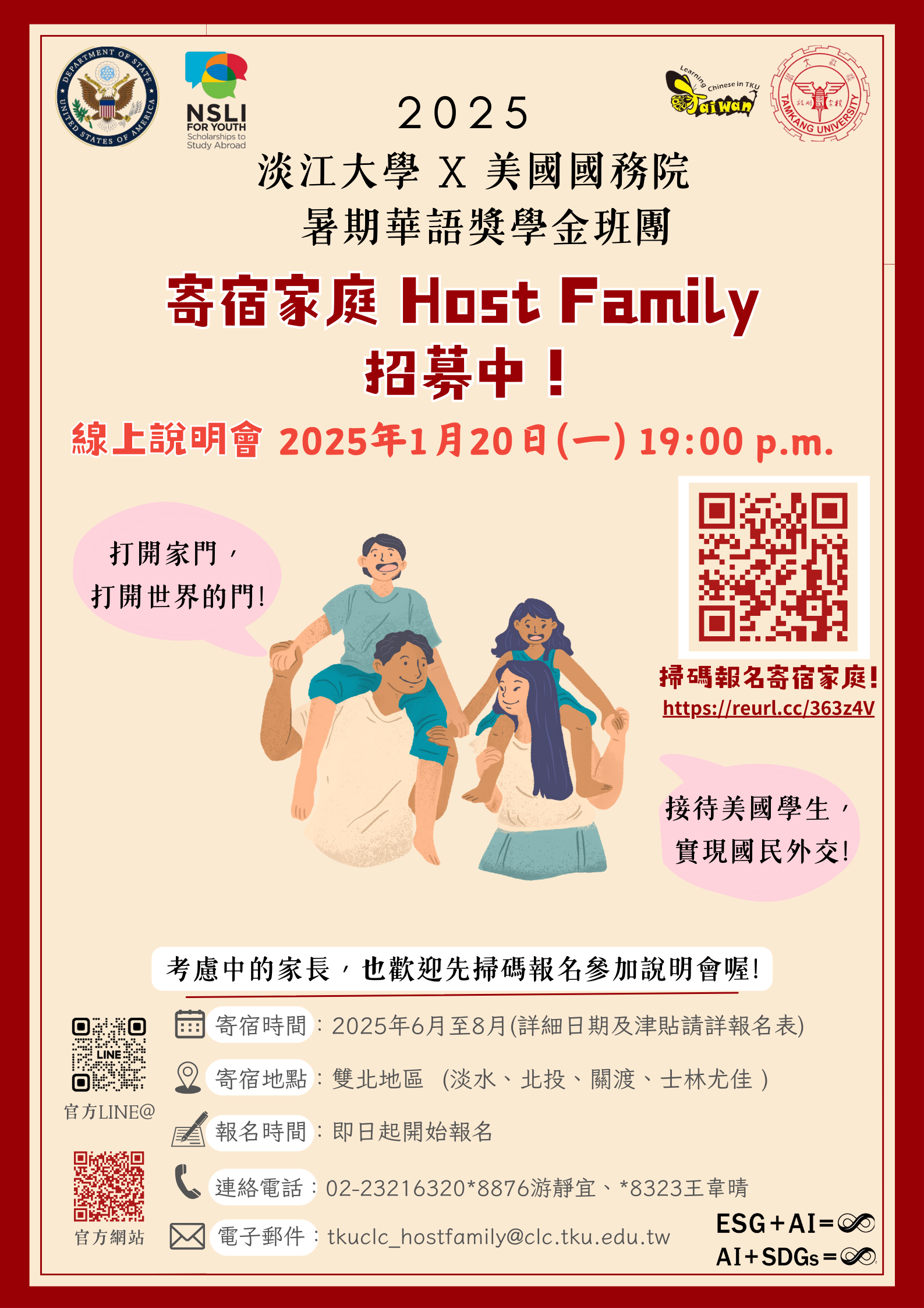淡江大學推廣教育處華語中心承辦2025年暑期「美國國務院華語獎學金研習班」徵選臺灣寄宿家庭,檢送招募海報,歡迎踴躍報名。