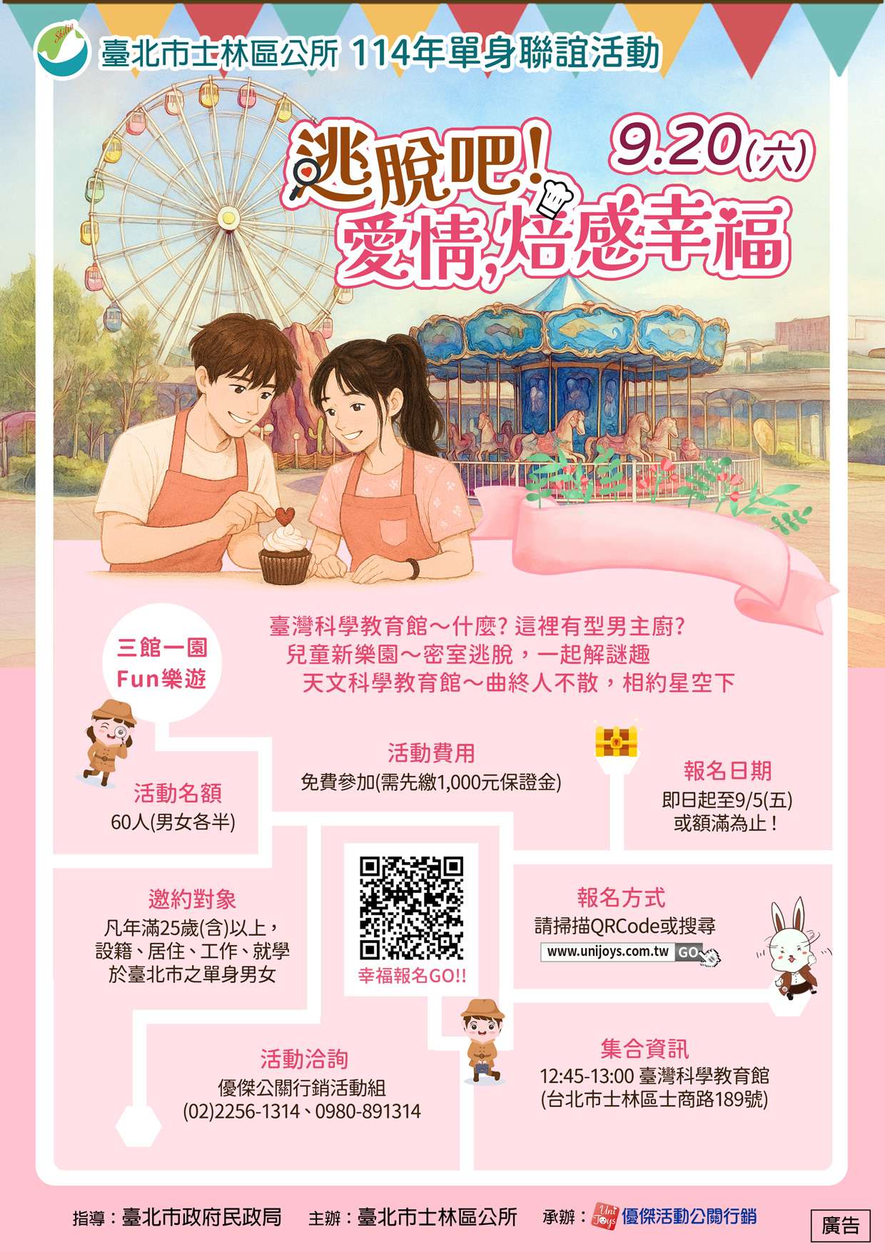 臺北市士林區公所114年度『逃脫吧!愛情,焙感幸福』聯誼活動,將於114年9月20日(星期六)12時45分至18時,假國立臺灣科學教育館及臺北市立兒童新樂園辦理,上報名時間自8月18日起至9月5日或額滿為止,凡年滿25歲以上,在臺北市居住、工作或就學,並且有穩定工作者(以士林區或未曾參加過本區活動者優先錄取)皆可報名,計60個名額,男女各30人,免費參加,活動詳情請參閱報名QRcode或洽詢聯誼專線(02)2256-1314、0980-891-314。