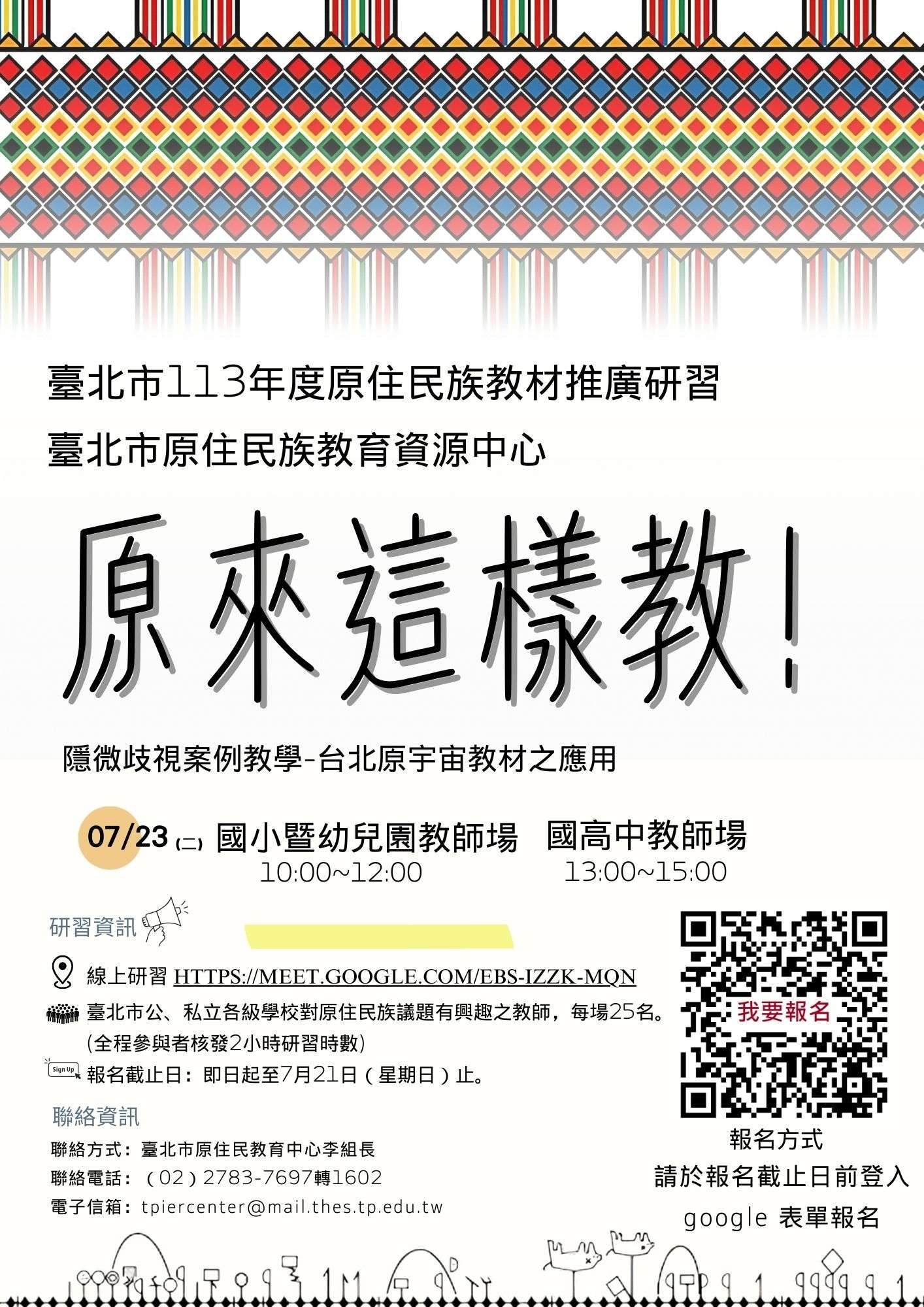 二、研習資訊如下: (一)研習對象: 1、臺北市高級中等以下學校各領域之正式與代理(代課) 教師。 2、對此議題有興趣者,歡迎外縣市對原民議題有興趣的教師共同線上參與。 (二)研習時間: 1、國小暨幼兒園教師上午場:113年7月23日(星期二) 10:00~12:00。2、國高中教師下午場:113年7月23日(星期二)13: 00~15:00。 (三)研習地點: 線上研習,https://meet.google.com/ebsizzk-mqn。 (四)報名時間:即日起至113年7月21日(星期日)前截止。 (五)報名方式(擇一): 1、逕至Google報名表單報名(https://forms.gle /wwGXUM33CbGLeEKS6)。 2、全國在職進修網 https://www5.inservice.edu.tw /index2-3.aspx。