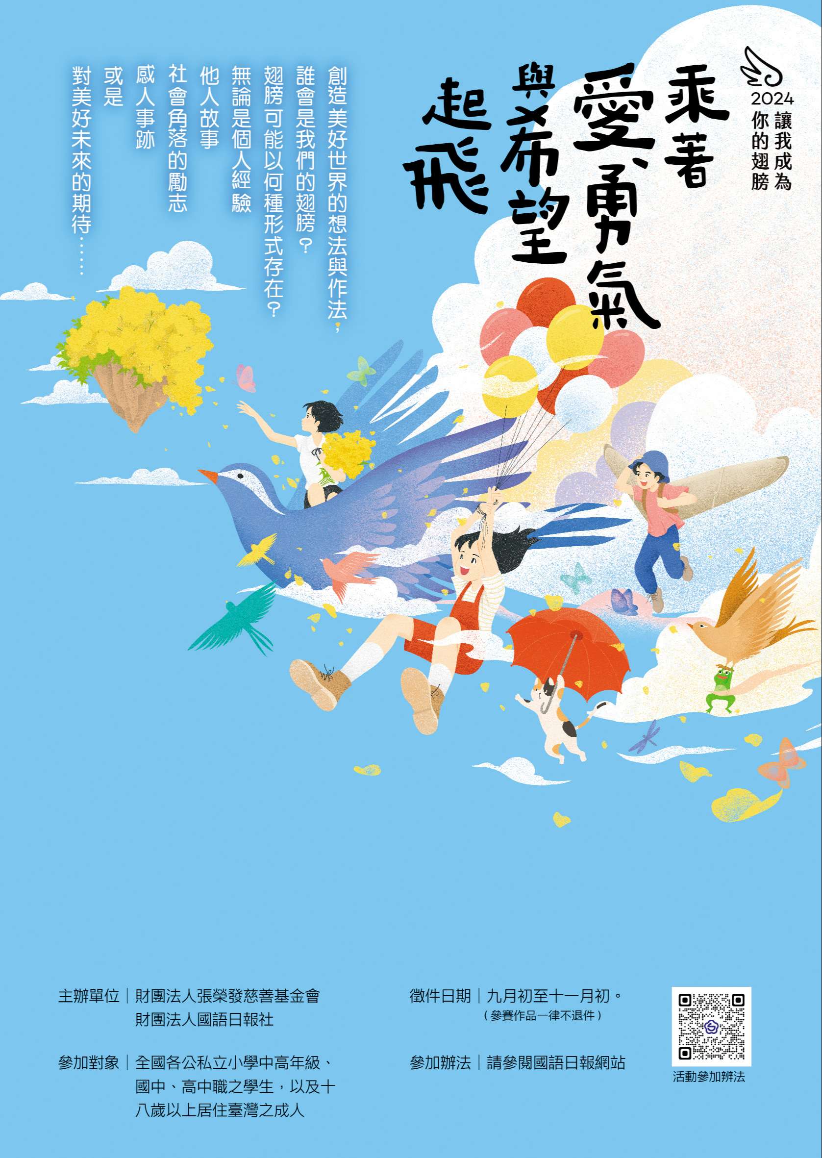 一、為了鼓勵正面助人的精神,強調社會連結與人際支持的重要,本社與張榮發慈善基金會合辦「2024讓我成為你的翅 膀──乘著愛、勇氣與希望起飛」徵件活動。