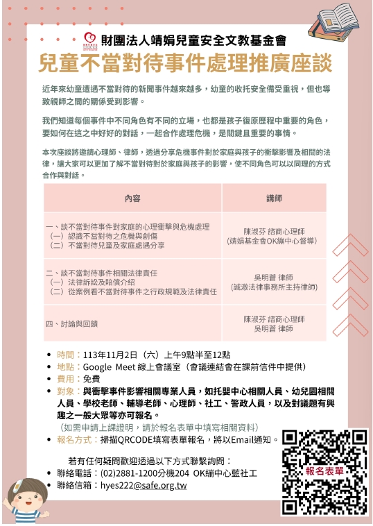 該基金會期待以兒童不當對待處理推廣座談,透過法律及心理專業分享不當對待事件處理經驗予相關人員,為孩子謀求最大的利益,特辦理旨揭線上免費座談,報名方式如附件,歡迎踴躍報名參加。