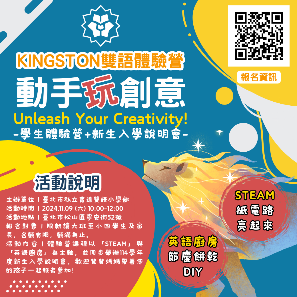 私立育達高級中學雙語小學部辦理113學年度「動手玩創意-Kingston雙語體驗營」暨新生入學說明會,歡迎參閱。