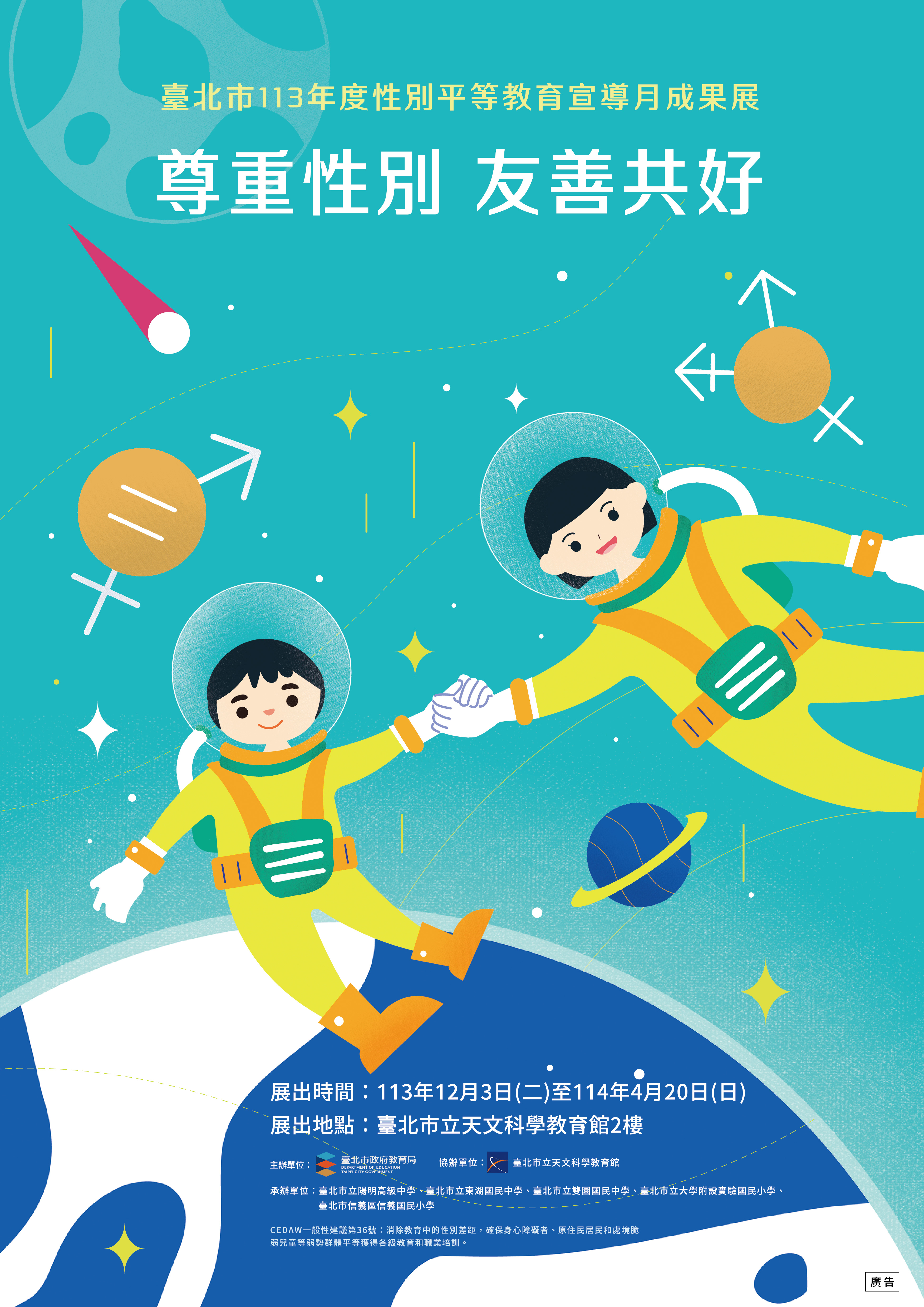 一、為落實臺北市性別平等教育工作,建立無性別歧視與無暴力之校園環境,及啟發學生在性別與尊重中察覺性別平等, 創造不同族群與性別間的對話空間,並表揚臺北市參與性別 平等教育宣導月徵件比賽之優秀學生作品,臺北市政府教育局辦理性別平等教育宣導月徵件比賽作品成果展。士林國小有兩位學生獲獎,作品也在現場展出,歡迎參觀。