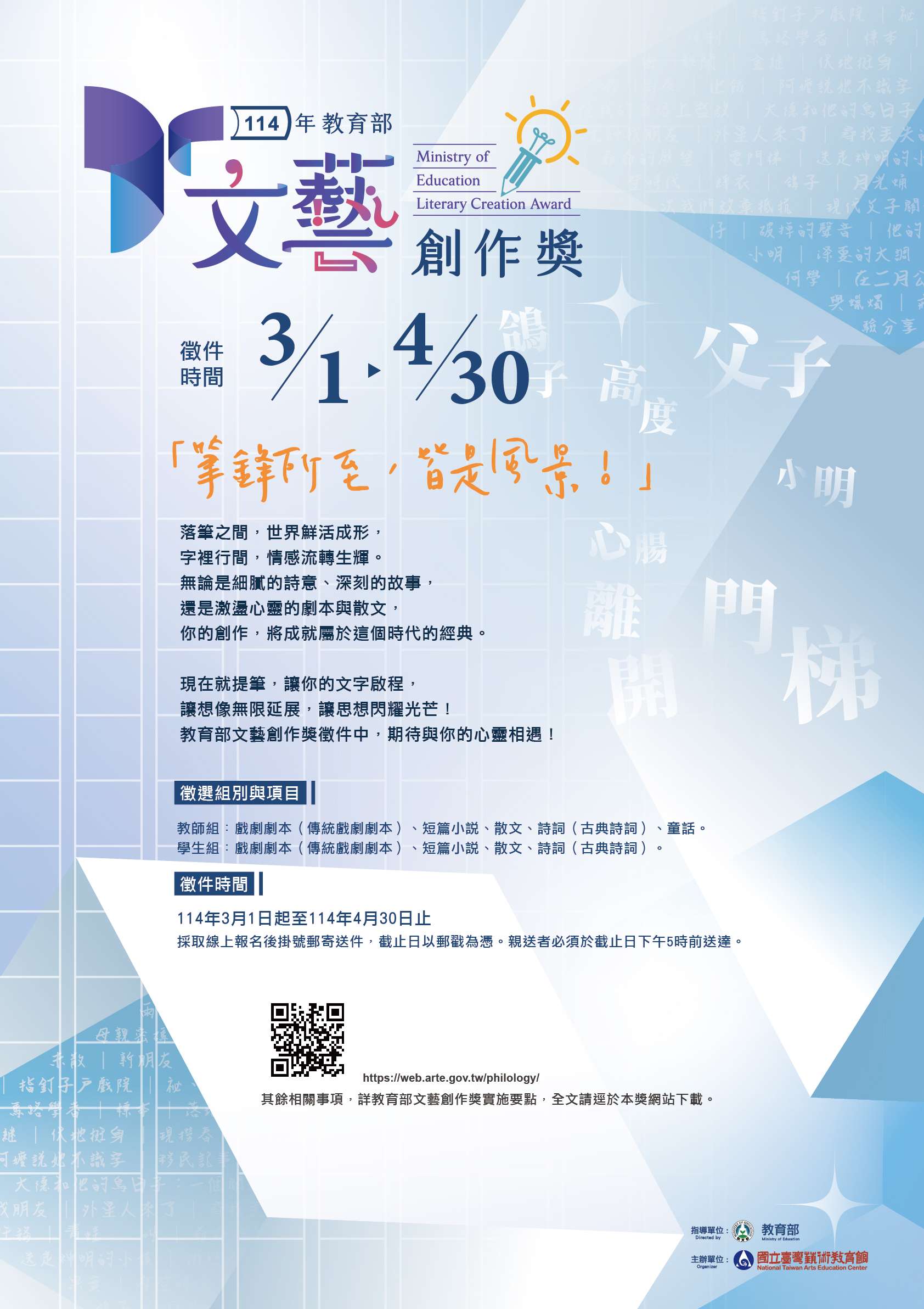 轉知114年教育部文藝創作獎自本(114)年3月1日起開始徵件,詳如說明,請查 照。