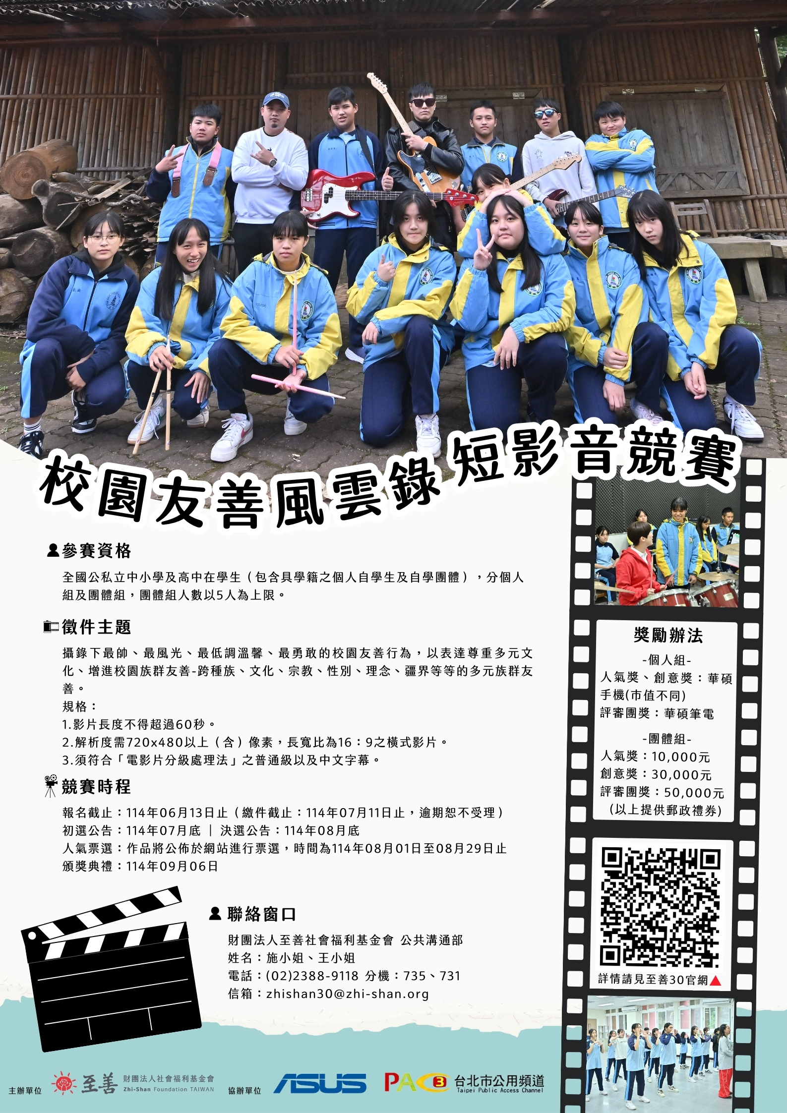 一、該基金會(官網:https://www.zhi-shan.org/)長期從事亞洲4地兒少發展工作,為響應「兒童權利公約」(CRC) 中禁止歧視原則,自2023年起倡議「校園族群友善」,已 連續兩年舉辦校園族群友善獎。該會將辦理「校園友善風 雲錄-短影音競賽」,邀請全國國小至高中學生共同參與,促進校園友善。