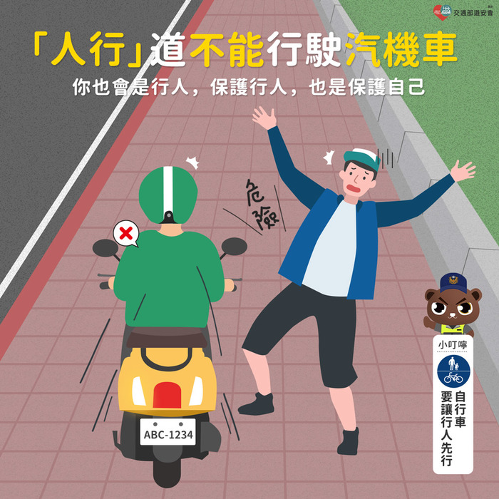 主題宣導「機車不騎人 行道、路口應停讓行人、左轉車應過中線再左轉」: