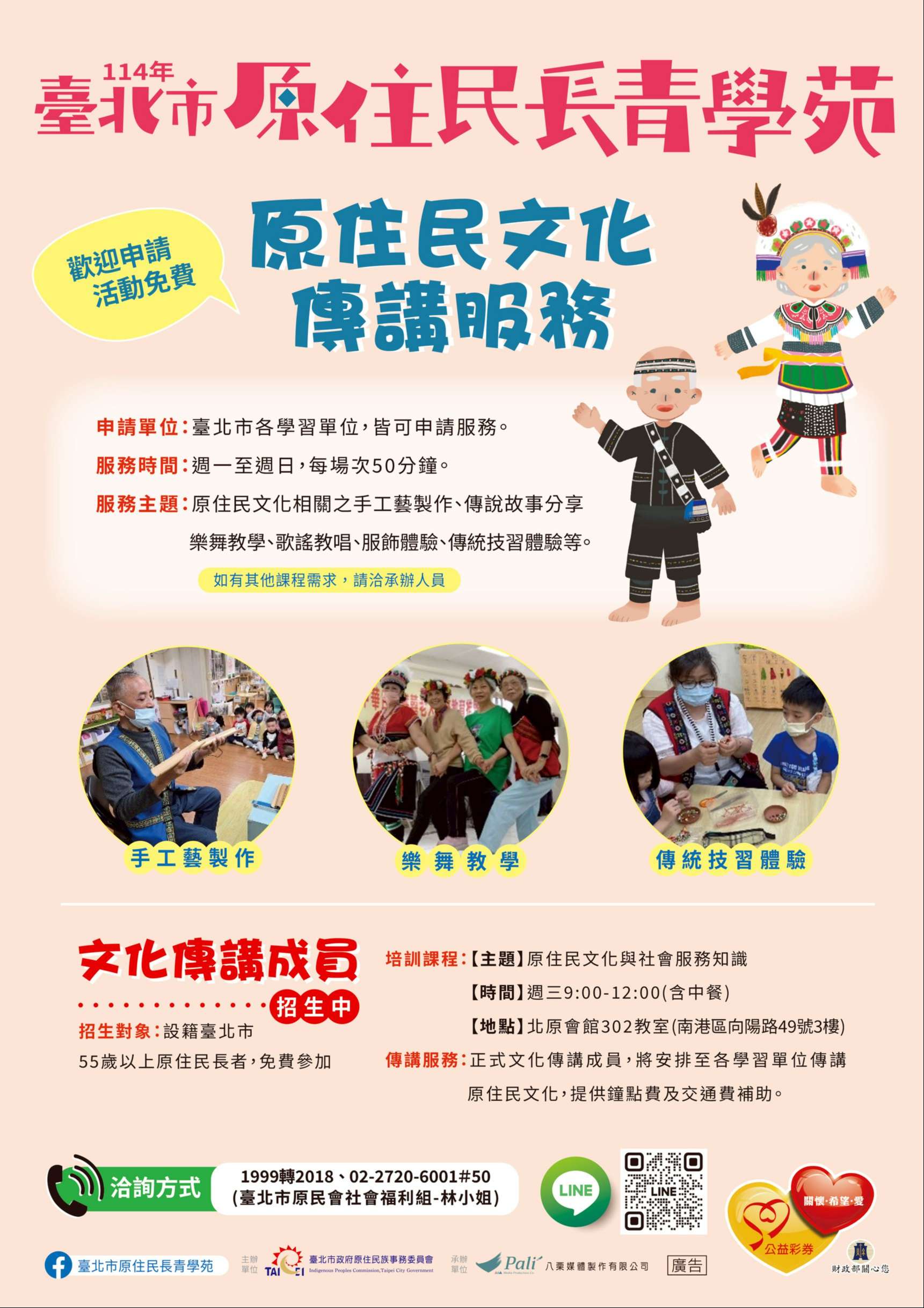 二、本會培訓原住民族長者擔任文化傳講員,至社區、學校及機構服務,服務內容包含教授相關原住民16族群介紹、手工藝製作、樂舞教唱、傳統技習體驗等課程,服務全程免費,申請方式請填寫報名表,向本會提出申請。