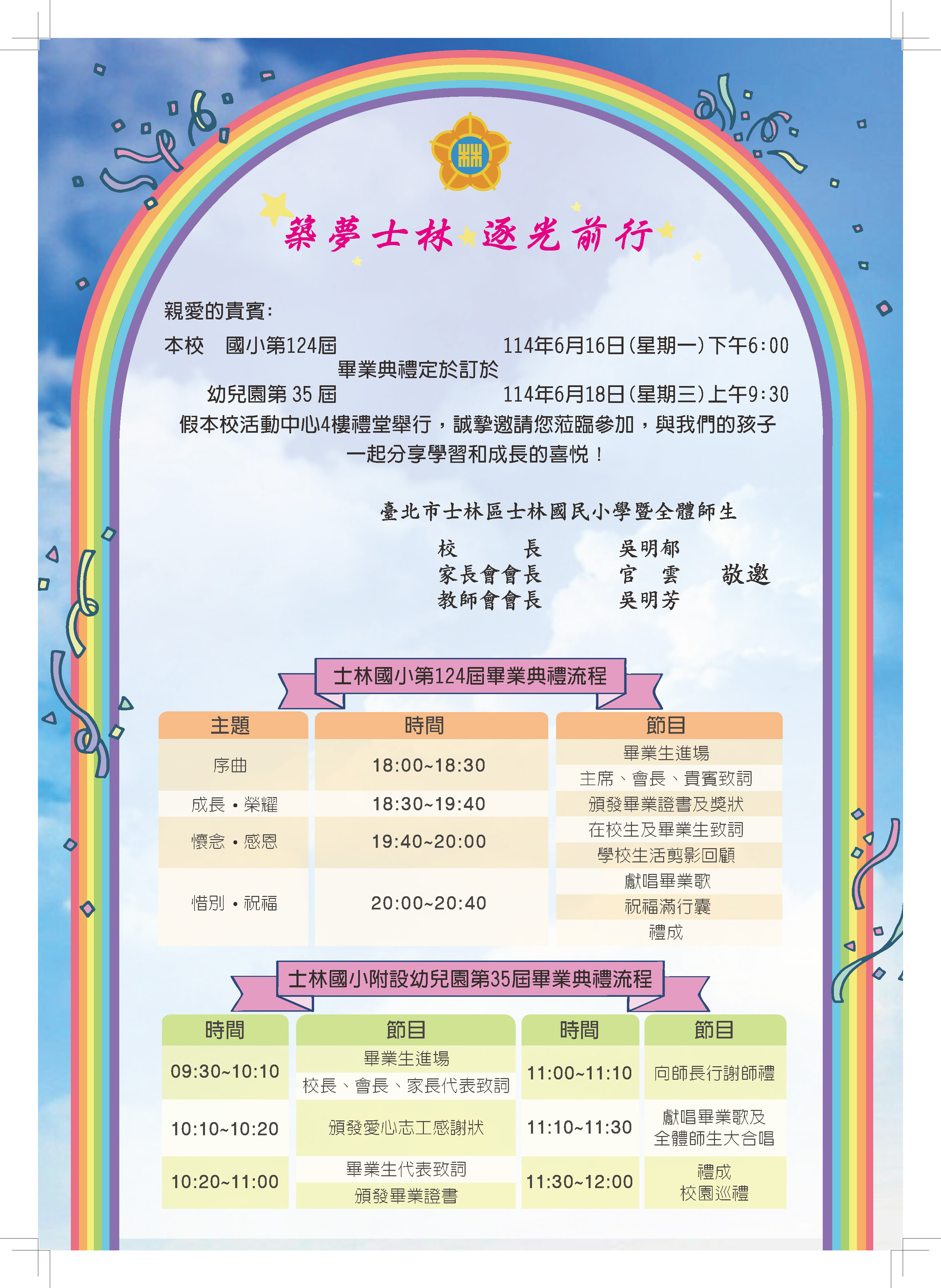 本校六年級畢業典禮定於訂於114年6月16日(星期一)下午6:00;幼兒園訂於114年6月18日(星期三)上午9:30,於活動中心4樓禮堂舉行。