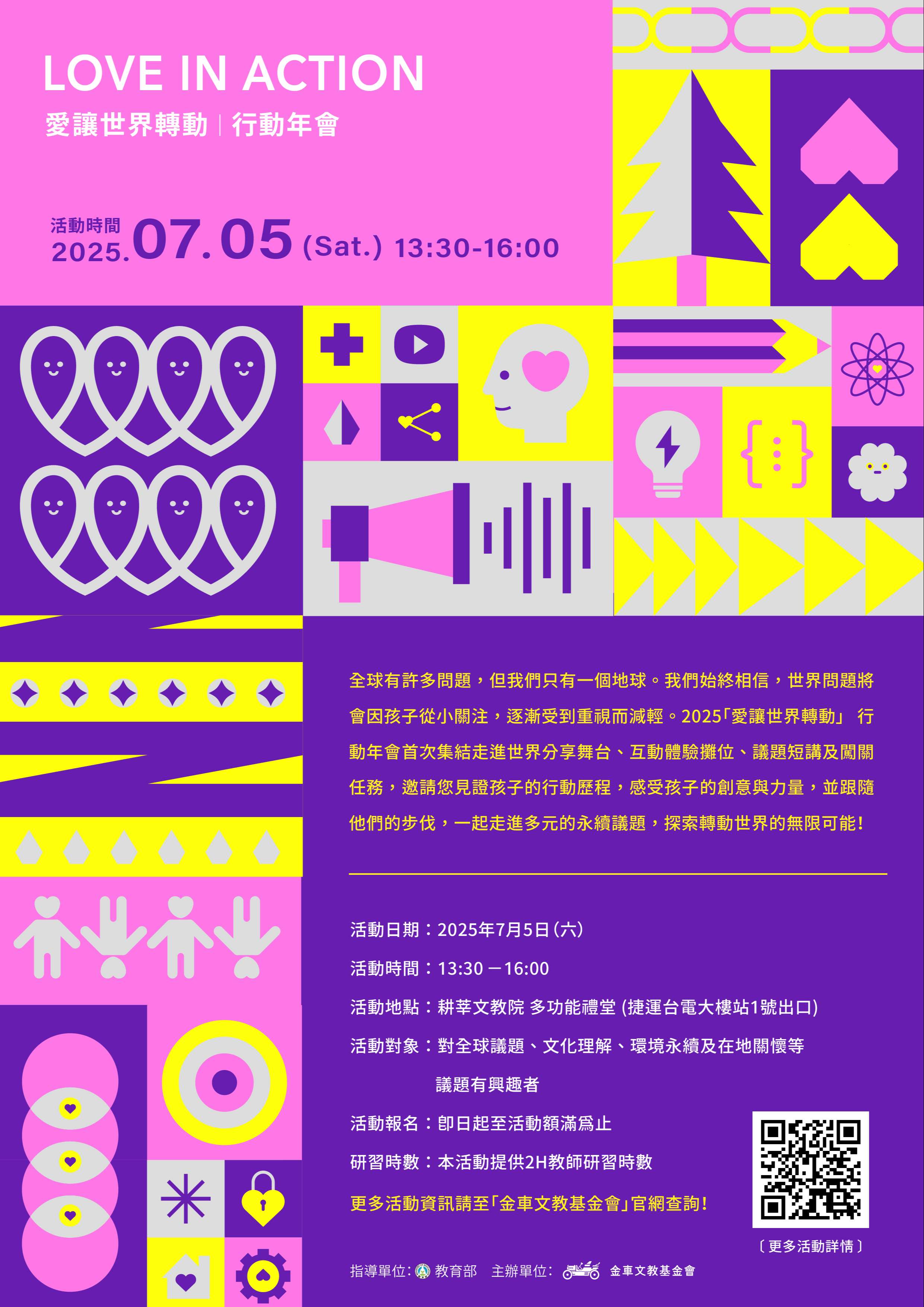 一、金車文教基金會長期推動「愛讓世界轉動」計畫,鼓勵老師陪伴孩子以國際視野、在地行動,走出教室落實社會關 懷。2025「愛讓世界轉動」行動年會活動特別集結獲獎團 隊師生行動成果,現場設有15個互動體驗攤位、4大議題專 家短講及闖關任務等豐富活動,教您如何透過教學設計與 課堂實踐,連結在地與國際重要的永續議題,打造有感的 學習氛圍,攜手孩子走進地方、邁向世界。