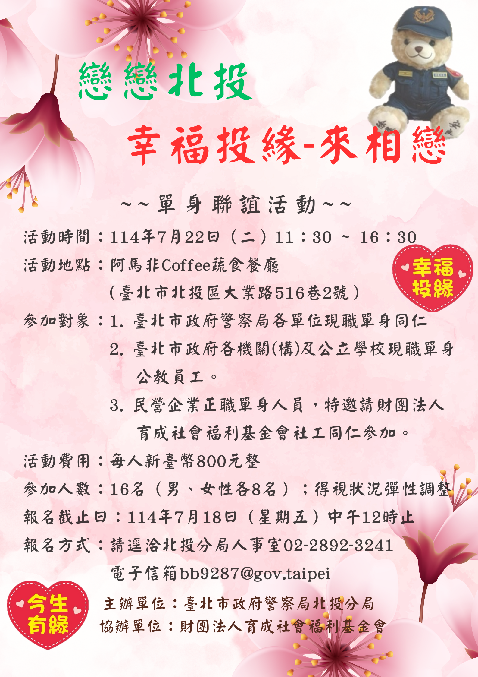 臺北市警察局北投分局主辦114年度「戀戀北投‧幸福投緣—來相戀」單身派對聯誼活動