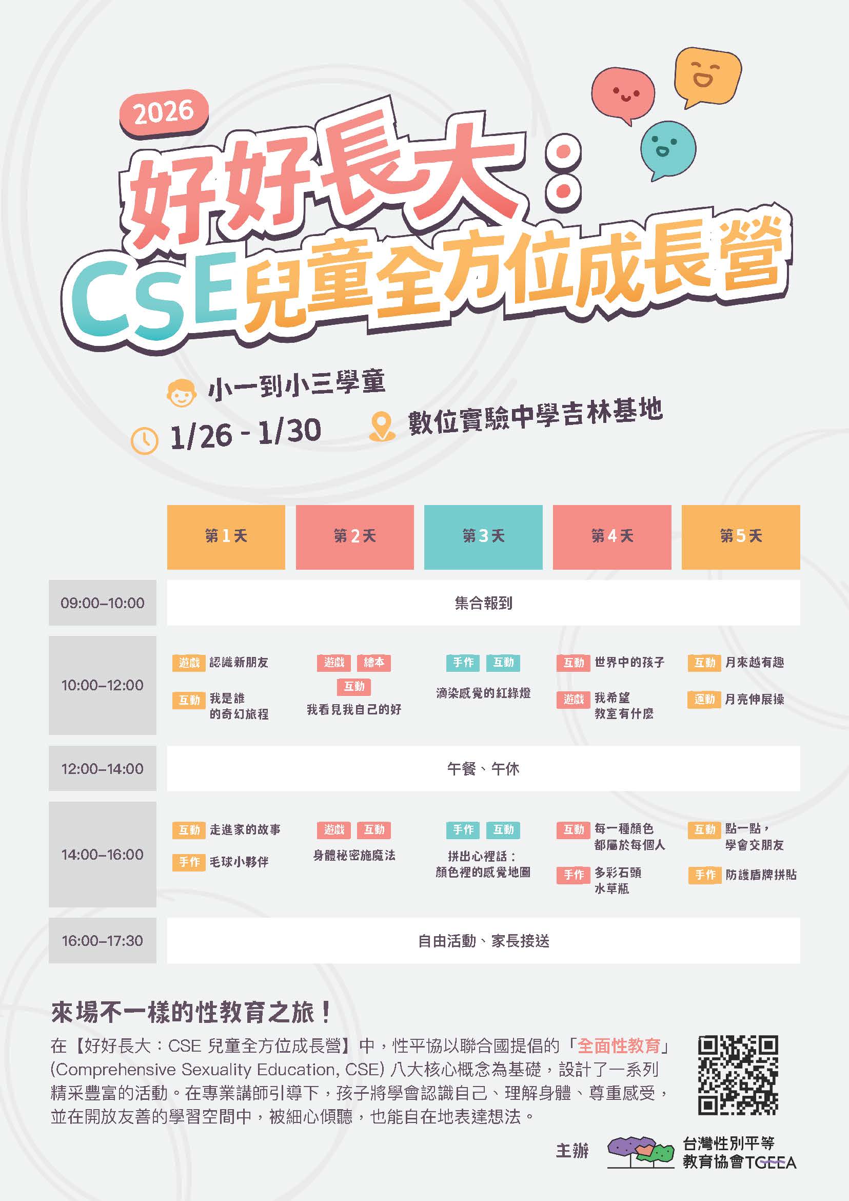 一、為響應國家教育研究院於2022年宣布將「全面性教育」 (Comprehensive Sexuality Education, CSE)納入我國健體課綱手冊之政策,該會擬於明(2026)年初辦理「好好長大:CSE兒童全方位成長營」。本營隊以聯合國教科文組織(UNESCO)全面性教育架構為課程設計基礎,透過為期五日之多元課程與活動,推廣全面性教育之相關知識、 態度與技能,並邀請國小一年級至三年級之兒童參與。