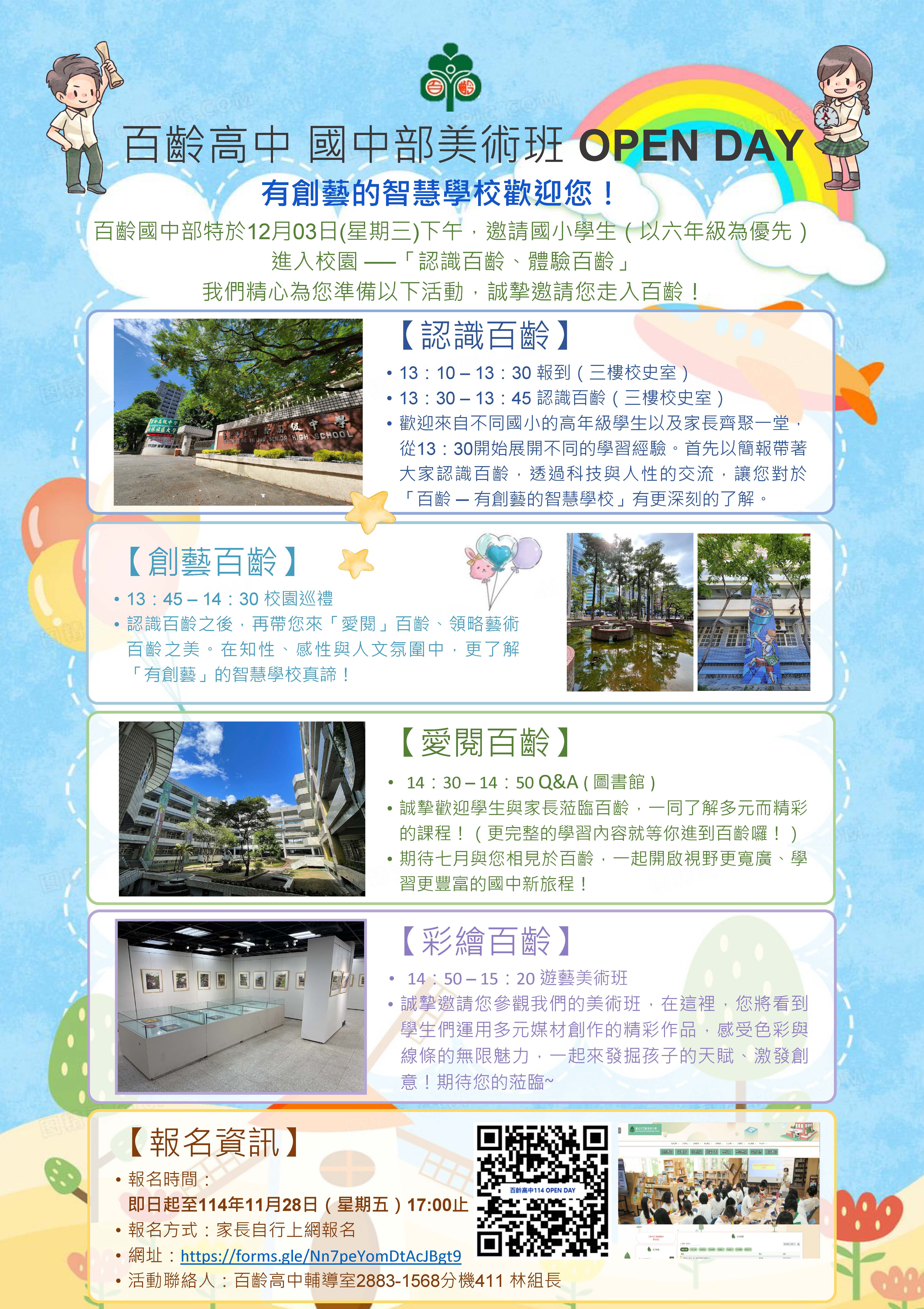 一、為讓國小學生及家長進一步了解百齡高中以及國中部美術班的專題課程,故辦理美術班Open Day活動以利其生涯規劃。
