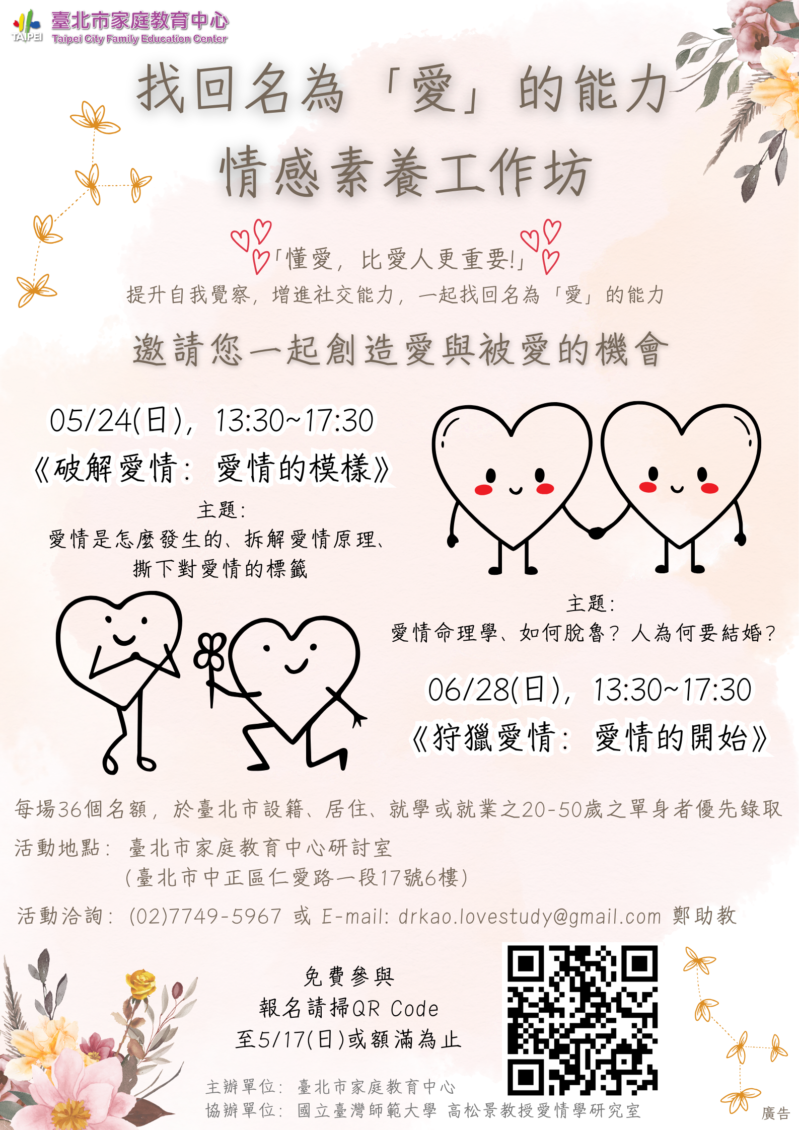 一、工作坊以人際關係及情感互動為主軸,透過講師分享、模擬約會及桌遊活動等方式,增進參與者對於自我認識及提升情感互動技巧。